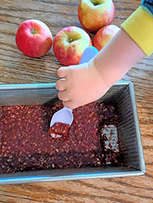 CANDY is of course another of Kiah’s favorite words, so why not call this apple-y snack candy? I saw this unusual recipe in one of my cookbooks from the 70s, and this seemed like a good excuse to make it; I changed a few things, and if I make it again, I’d modify it to use plain gelatin to reduce sugar and dye — but we’ll have to see what Bob says about it first. Appropriately, Kiah declined to try it and wanted an apple instead.