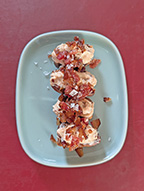 Stir together the cream cheese, pecans, and paprika. Slice the dates open if they aren’t already, just opening them enough to hold the filling, and then spoon in some of the cream. Top with the bacon and salt. Eat.
