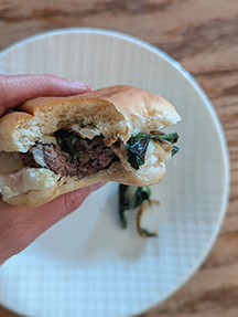 Heat the butter in a cast iron skillet, and add the onions with a pinch of salt, cooking until browned. Stir in the spinach until fully wilted, then remove from skillet. Add another knob of butter over medium-high heat, then arrange the patties in the skillet, pressing them down until about ½” thick. Season liberally with salt and pepper, and flip over once the bottom is nicely browned. Season the new top sides, top each with a slice of cheese, and cook to desired doneness (i.e. not very, if you’re Brian). Serve in the buns with plenty of the sauteed spinach.