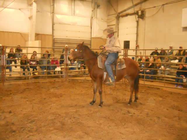 The coming two-year-old bay Dash For Cash bred gelding had been handled, so Scott Daily led him into the round pen with a black rope halter that had a long rope attached.
