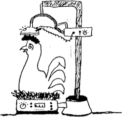Faithful readers will recall that I long-ago I invented a device that does improve egg-laying efficiency. It’s called the Hi-Volt Egg-O-Matic and here’s how it works.
