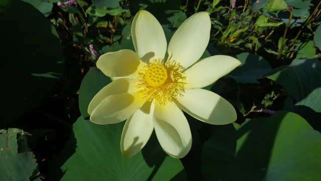 When driving through the McPherson Valley Wetlands lately I’ve noticed amazing yellow flowers in some of the many ponds. This morning I donned my waders and got a firsthand look at what I was seeing. I crossed the surrounding drainage ditch and clamored up the tall dike on the back side. What greeted me was like something from an exotic Chinese water garden. I’ve always called them water lilies, but Jason Black, Public Lands Manager for the Kansas Dept of Wildlife, Parks and Tourism who manages the entire McPherson Valley Wetlands system tells me their proper name is American Lotus, and says they are in fact native to Kansas. They filled the shallow waters in the corners of the pond like a mat of immense green leaves dotted with bold, pale, yellowish-white flowers the size of cereal bowls. Most of the time these plants are shown with their enormous leaves floating on the water, but here where the water was shallow they actually rise above the water’s surface. Most of the leaves on these plants were about a foot wide, give or take, and the flowers that were fully opened measured 6 inches across. Leaves on older American Lotus plants can reach 24 inches in diameter. An interesting phenomenon is that American Lotus leaves never get wet; water forms a droplet on them and just runs off.