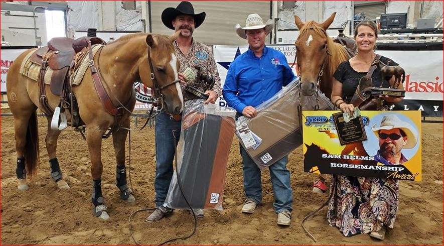 Matthew Jobe, Windsor, Missouri, presented awards to Josh Ingle, Carbon Hill, Alabama, and Leslie Berry, Wheeler, Texas, as the top shooters at the United States Mounted Shooters Mid-South Nationals in Cordova, Tennessee.