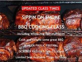 Sippin on Smoke, BBQ cooking class will be held 7 A.M. to 2 P.M. October 1 at 2nd and Main St. This whole hog demonstration sponsored by the Buhler Frolic Festival will be an introductory BBQ class covering such things as equipment, meat selection and preparation, competition techniques. This is a hands on class where you prepare and sample great BBQ. Class size is limited to 30 students. Go to www.facebook.com/sippinonsmoke for more information or sign up.