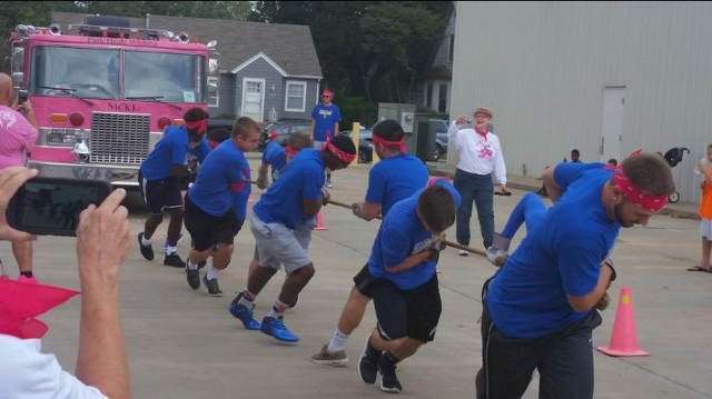 The Lindsborg Volunteer Fire Department won the 6th Annual Battle of the on September 24. This event is sponsored by the Lindsborg Community Hospital to raise funds for the Smoky Valley Cares Fund which is used to help patients fighting cancer. This year raise around $3,000 from the seven teams that competed. Each team of 10 pulled the pink fire truck a set distance. Cowboy Austin Hagar was on hand to demonstrate his cowboy roping techniques which added to the fun of the day.
