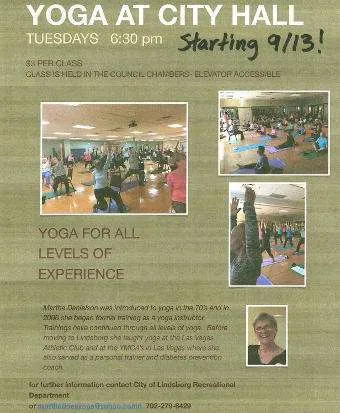 Yoga with Martha Danielson, classes, are held every Tuesday evening on the second floor of City hall, 101 S. Main. This class is for beginners or others that are trying to ease back into yoga. The classes are $3 each period. For more information, contact the Recreation Director at 785-227-3333.