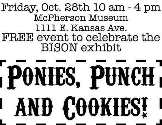 Ponies, Punch and Cookies! Will be held at the McPherson Museum 1111 E. Kansas Ave. on Friday, October 28 from 10 A.M. to 4 P.M. This event will help celebrate the Bison exhibit coming to the Museum. There will be Buffalo Chip Cookies, Sunflower Punch. Scotty the Clydesdale and two miniature ponies from Sundance Farm will be there form11 A.M. to 2 P.M. This will be fun for the whole family.