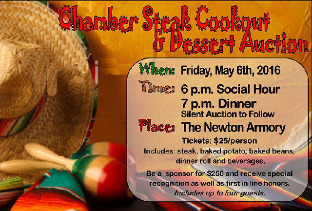 On Friday May 6th at The Newton Area Chamber of Commerce is holding at Steak Cookout at the Armory. Social Hour starts at 6 pm, and Dinner at 7 pm, with a Silent Auction to follow. Tickets are $25 person, and includes your steak, a baked potato, baked beans, a dinner roll and beverages!