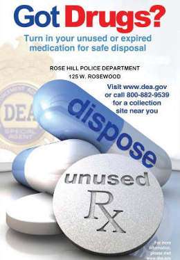 The Rose Hill Police Department will be collection unused or expired medications 10 A.M. to 2 P.M. Saturday, October 22. This is the 12th time in six years that the Police Department and the Drug Enforcement Administration (DEA) has worked to prevent pill abuse and theft by ridding home of potentially dangerous, expired and unwanted prescription drugs. Bring the medications to the Rose Hill City Hall at 125 W. Rosewood St. The DEA cannot accept liquid needles or sharps only pills and patches. The service is free and anonymous no questions asked.