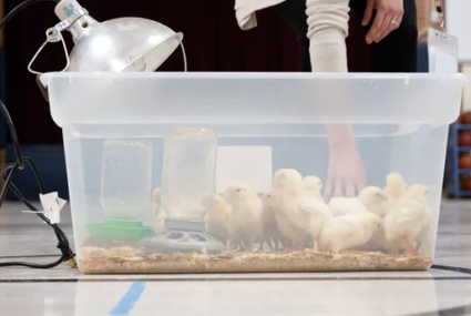 Each classroom will be responsible for a group of about 20 chickens, beginning in a brooder box.