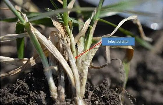 Volunteer wheat. Volunteer wheat that is allowed to grow for two to three weeks, especially in wet summers, can enable the fly to produce an extra brood and infest the planted crop in greater numbers. Volunteer wheat not only increases the population but also may render other practices, such as planting after the BPMP date, less effective. The adult fly is capable of dispersing to adjacent fields to lay eggs, so it is vital to destroy volunteer wheat in the area at least two weeks before the planted crop germinates. This practice also helps reduce the incidence of wheat streak mosaic virus.