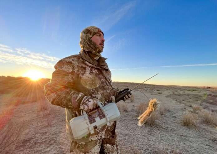 Garrison’s heavy-duty coyote calling boombox sings out from the valley where he stashed it in a bush. Nearby, a motorized decoy waves a piece of fur back and forth.