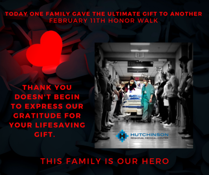 Last week, as more than 100 Hutchinson Regional Medical Center (HRMC) employees lined the hallway leading out of the ICU, the unit’s doors opened and a hospital bed emerged. All were silent as a donor about to give life to others through organ donation, was wheeled to a surgical room to begin the process.