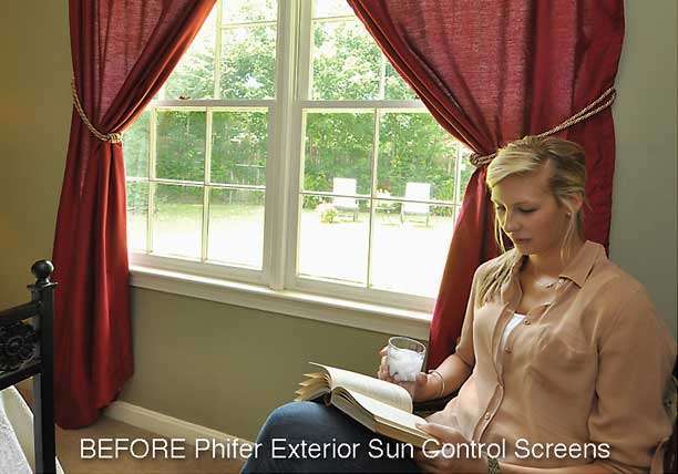 - Don’t let your cooling dollars go out the window. According to the U.S. Department of Housing and Urban Development, “A good way to keep your house cool in the summer is to shade it from the outside…any way that stops the sun before it gets through the glass is seven times as good at keeping you cool as blinds or curtains on the inside.” Solar screening is just such an outside sun barrier, with specially designed yarns for strength and a tight weave for better shading ability. Sun control screens work with the window open or closed, offering daytime privacy while reducing the chances of drapes and furniture fading. Just like conventional fiberglass screening, these screens offer excellent insect protection, even against tiny pests, are easy to see out of, and let air flow in well when the window is open. Using the same method as standard insect screening, Phifer’s Sun Control Products can be installed by a professional or the homeowners themselves as a screen on the outside of the window or in a porch application. The screens block 65 to 90 percent of solar heat and glare before they enter the glass for a more comfortable indoor temperature, more efficient air-conditioning and energy conservation. In fact, studies have shown that shaded windows can save up to 25 percent of the cost of air-conditioning when compared to unshaded windows. These shading fabrics are woven with either fiberglass or vinyl-coated polyester yarns, and many have Microban® antimicrobial product protection to inhibit the growth of bacteria, mold and mildew. Phifer Sun Control Products come in a range of colors, including black, beige, brown, gray, stucco, rattan and bronze, to complement the appearance of the home.