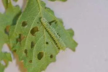 Young larvae will remove the green layer of a leaf leaving behind a clear material. As the larvae mature, they make holes in the leaf and eventually may consume all of the leaf but the major veins.