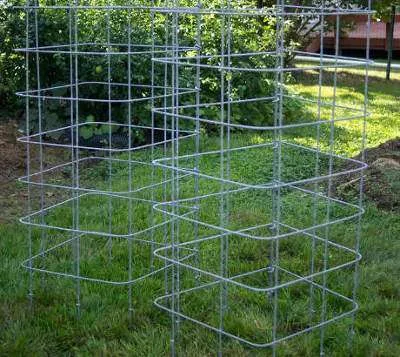 Count off 13 squares but cut each horizontal wire at the end of the 13th square. This will leave a series of 12 complete squares horizontally with prongs left on the 13th square. Use these prongs to make a cylinder by bending the prongs over the vertical wire on the first square. Cages using this method will be about 2 feet in diameter. Tomatoes with large, rangy vines need all five feet of the mesh, but those with shorter, semi-determinate vines can get by with a shorter cage.