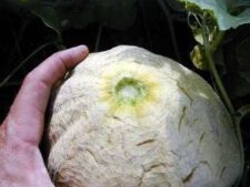 Honeydew melons are the most difficult to tell when they are ripe because they do not “slip” like muskmelons. Actually, there is one variety that does slip called Earlidew, but it is the exception to the rule. Ripe honeydew melons become soft on the flower end of the fruit. The “flower end” is the end opposite where the stem attaches. Also, honeydews should change to a light or yellowish color when ripe, but this varies with variety. (Ward Upham)