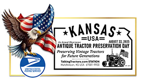 Obtain your USPS Pictorial Postmark. The United States Postal Service is proudly supporting Antique Tractor Preservation Day, with an exclusive, limited-time only Pictorial Postmark, to be made available starting August 22, 2025. Patrons who want a Postmark may visit the Hutchinson, KS Post Office in person, or request via Mail Order by: Affixing stamps to any envelope or postcard, placing the envelope or postcard in a larger envelope and addressing it to: Pictorial Postmark, TalkingTractors.com Station, 128 East 1st Ave., Hutchinson, KS 67501-9900.