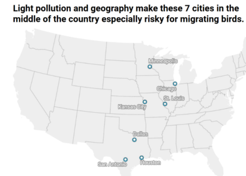 Cities in the middle of the continent, such as Chicago, Kansas City and Dallas, take a heavy toll on migrating birds. For birds, these population centers pose endless hazards right along one of the most important migration corridors on the planet.