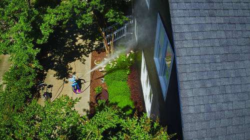 For best results when using a pressure washer – whether you’re power washing the patio, cleaning outdoor furniture, washing outdoor windows, rinsing out the grill or scrubbing messy garbage bins – aim the spray nozzle perpendicular to the surface you’re cleaning. Use a steady motion because inconsistent pressure leads to striping. Be sure to “feather” your strokes, overlapping each previous sweep with half the height of the new sweep. Also, allow the detergent soak into difficult stains for 3-5 minutes before rinsing so it has time to latch onto the stain and pull it from the surface.