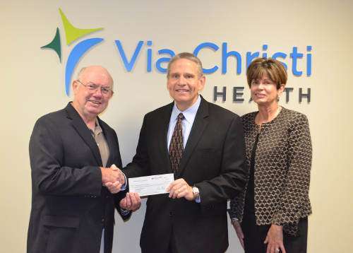 Riverside Health Foundation board member Ron Stephen presented the check to Mike Mullins, chief executive officer of Via Christi Health and Kansas Ministry Market Leader for Ascension, and Monica Coen, Via Christi’s chief philanthropy officer.