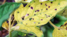 Septoria leaf spot usually appears earlier in the season than early blight and produces small dark spots. Spots made by early blight are much larger and often have a distorted “target” pattern of concentric circles. Heavily infected leaves eventually turn yellow and drop. Older leaves are more susceptible than younger ones, so these diseases often start at the bottom of the plant and work up. Mulching, caging, or staking keeps plants off the ground, making them less vulnerable. Better air circulation allows foliage to dry quicker than in plants allowed to sprawl.