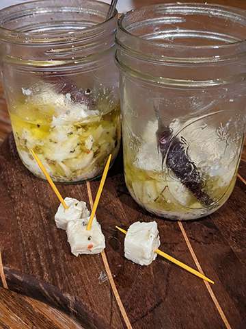 Dump the seasonings and herbs into the bottom of a wide-mouth glass pint jar, fill the jar halfway with cubed cheese, shake it to distribute the seasonings (lid on!) and add the remaining cheese. Slowly pour some of both oils into the jar until it covers the mozzarella.