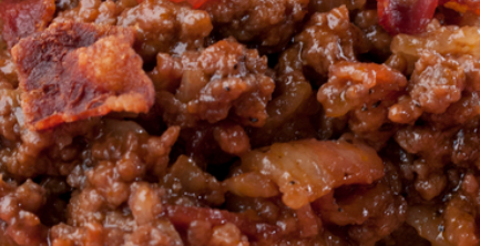- In the same skillet over medium heat, brown ground beef and onion 6 to 8 minutes or until no pink remains, breaking up clumps as it cooks; drain off any excess fat. Add crumbled bacon, barbecue sauce, salt, and pepper and cook 5 minutes, or until heated through.