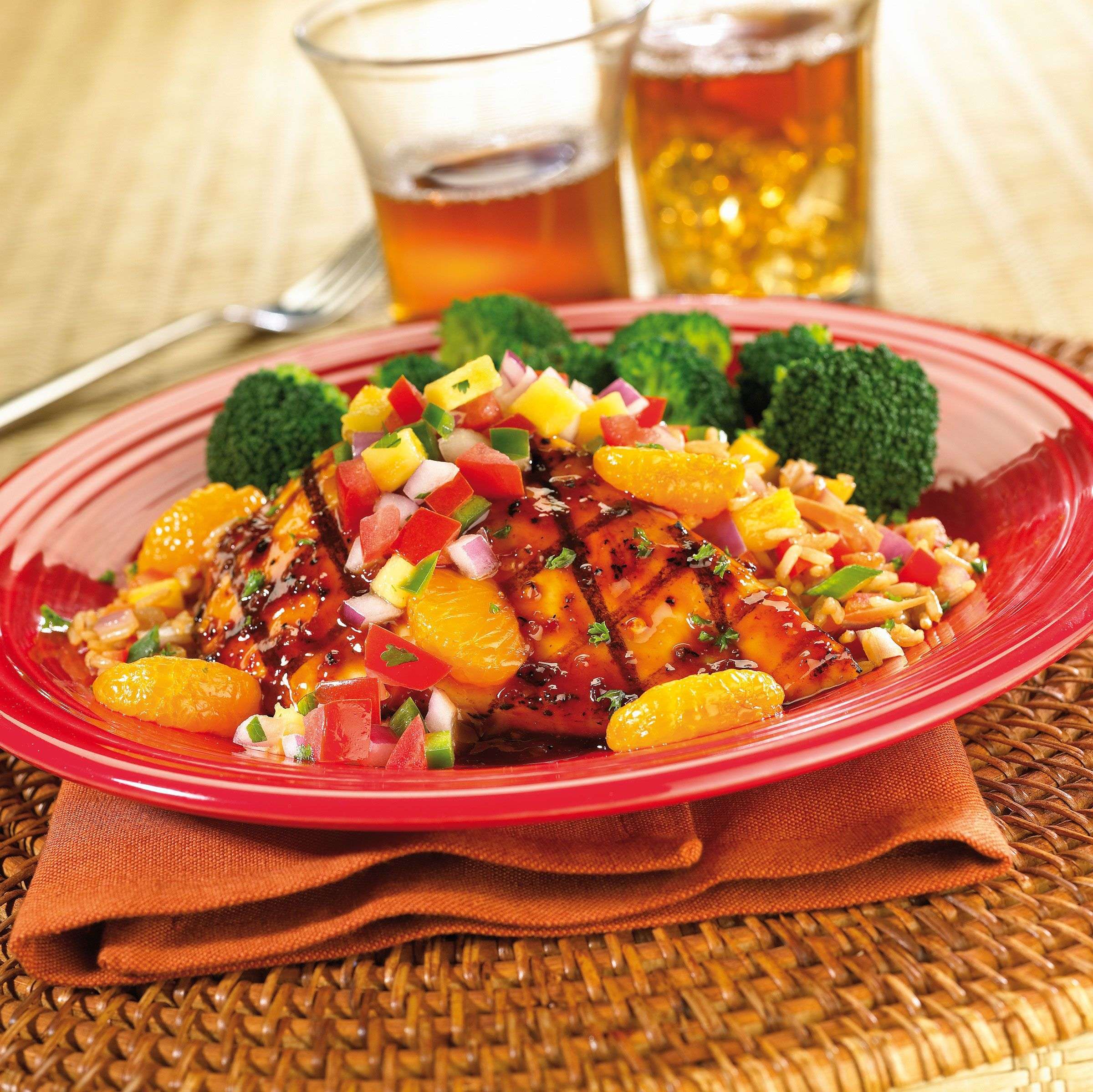 Glaze the chicken breasts on all sides and serve topped with the Mango Pico de Gallo.