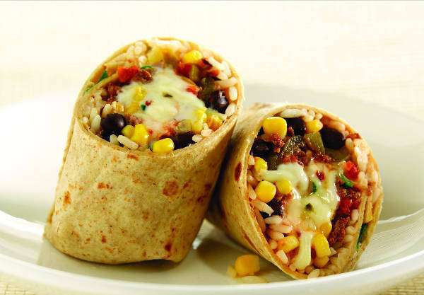 Spread 1/3 cup rice on center of tortilla, leaving 1/2-inch border. Scatter about 2 tablespoons beans and 1 1/2 tablespoons corn over rice. Spread 1/3 cup beef mixture and 1/4 cup cheese over corn. Top with 2 teaspoons salsa and a few slices green onion. Fold in two opposite edges of tortilla 1 inch each and roll up. Place seam-side down on microwave-safe dish.