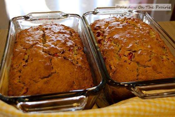 Bake 8 inch loaves 1 hour 15 minutes, and 9 inch loaves 55 to 65 minutes, or until wooden toothpick comes out clean. Remove from oven and cover with towel until cool.