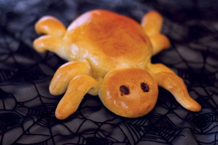 - Beat 1 egg and 1 tablespoon water; brush on spider. Bake at 350°F, 15-30 minutes, depending on size of spider. Spider should be golden brown.