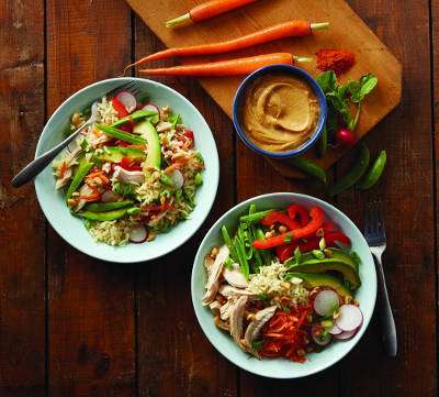 In center of individual plates, place about 1 cup rice. Arrange chicken, carrots, pea pods, red pepper, avocado, radishes, peanuts and green onions around rice then drizzle with dressing.