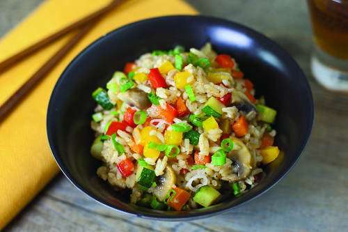 Heat heavy-bottomed, nonstick skillet over high heat. Add vegetable oil, garlic and onions. Stir-fry 1-2 minutes, or until lightly browned. Add mushrooms, carrots, zucchini, red bell peppers and yellow bell peppers; stir-fry 3 minutes. Add rice; stir-fry 3 minutes.