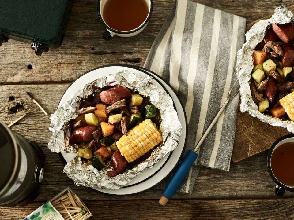 - Place a 12″ x 12″ square of heavy-duty aluminum foil down on work surface. Add 1/4 of beef and vegetable mixture to center of foil. Fold right and left edges in and roll together to close. Fold top and bottom edges in and roll to close package. Repeat with remaining mixture for a total of 4 packets.