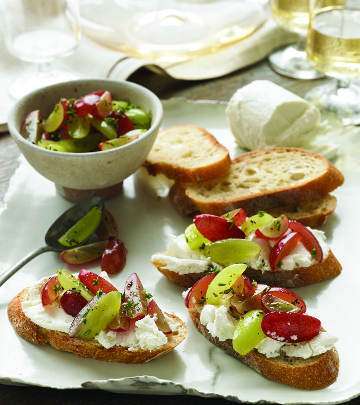 In medium bowl, combine grapes, lemon juice, honey, thyme, salt, pepper and olive oil. Spread each baguette with goat cheese and top with grape mixture.