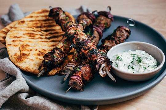 Serve kabobs immediately with a generous dollop of tzatziki and grilled flatbreads.