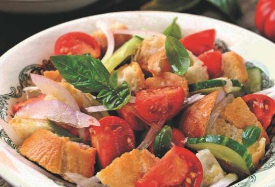 3 large ripe tomatoes, cut into 1-inch cubes 2 tablespoons green olives, pitted and chopped (capers may be substituted) 1 medium red bell pepper, seeded and quartered 1/2 large red onion, cut in half and then into 1/4-inch slices 1/2 small loaf crusty whole-grain French or Italian bread, cut into 1-inch slices and halved Heat grill. In mixing bowl, whisk together garlic, mustard, vinegar, olive oil, salt and pepper; set aside. In large bowl, gently combine basil, cucumber, tomatoes and olives. Brush bell peppers and onion slices on one side with oil mixture. Place oil-side down on hot grill and cook 3-4 minutes. Brush other side with oil mixture, turn over and cook additional 3-4 minutes. Remove from grill. On cutting board, cut peppers into 1/2-inch slices and separate onion rings. Add peppers and onions to vegetable mix. Add remaining oil mixture and toss to coat. Toast both sides of bread until browned. On serving platter, layer bread and top with vegetables and basil mixture.