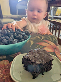 Oh well, I had to do laundry anyway. And that vibrant blue color is not only an indication of rich blueberry flavor, but also of the presence of anthocyanins, powerful antioxidants found primarily in blue, purple, black, and red foods. Berries have the highest concentrations of anthocyanins, which may have significant health benefits, including reducing heart disease, lowering blood pressure, and improving brain function. All sorts of things that I as her mother care deeply about Kiah getting as she grows, and all sorts of things that she couldn’t care less about, as long as whatever she’s eating tastes like blueberries.