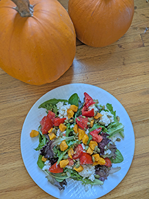 With all the rich, heavy food typically on a Thanksgiving table, it’s always nice if there’s a fresh salad too. While I’m actually the one making pumpkin pie for our family’s celebration, I might cut up an extra pumpkin to dice and roast to have available for leftover-turkey salads. Like for essentially any vegetable (even though I know pumpkins are botanically fruits), a high-heat roast amplifies pumpkins’ natural flavor within, providing a nice flavor and texture complement to the rest of this salad.