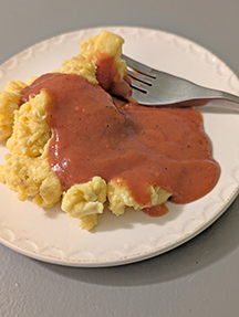 In case you haven’t met this old friend yet, tomato gravy is exactly what it sounds like. Tomato, made into a gravy. My grandma had a special hankering for tomato gravy and fried cornmeal mush, and I think that’s the only way I’ve ever been served it. I don’t feel sheltered in my food experiences at all, but somehow I was never introduced to tomato gravy and scrambled eggs, though it’s apparently not a niche thing.
