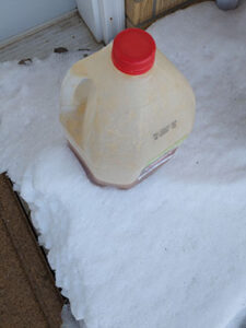 a plastic gallon jug of cider, half full