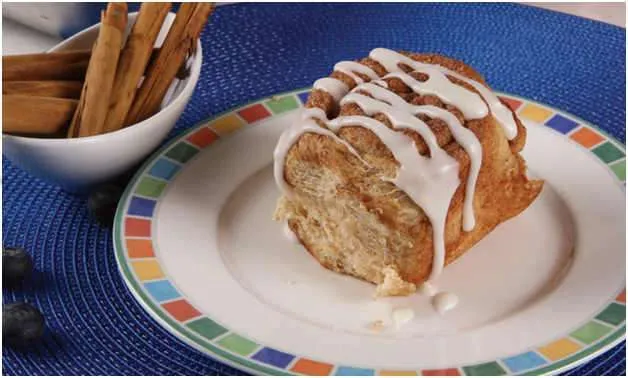 - While rolls cool slightly, prepare glaze. In small bowl, whisk together confectioners’ sugar and protein shake until smooth. Drizzle rolls with glaze. Serve warm.