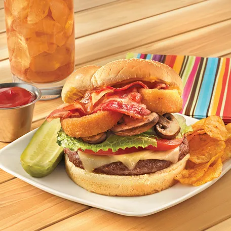 - To assemble burger: layer bottom bun with patty with cheese, tomato, lettuce, mushrooms, two onion rings, two pieces of bacon and top half of bun.