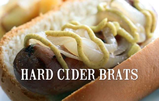 Place the onions along the bottom of a foil pan and layer the brats into the pan on top of the onions. Pour the two pints of Angry Orchard hard cider (or enough to just cover the brats) into the pan and top with the diced apples.