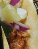 - Cook over medium heat 5 minutes or until hot. Stir in chicken and cook 6 to 8 minutes or until heated through. Evenly divide chicken mixture into tortillas and garnish with reserved pineapple, onion, goat cheese, and cilantro. Serve immediately.
