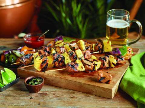 Pour marinade into re-sealable bag and add cubed pork tenderloin. Marinate for up to 24 hours in refrigerator. Place tenderloin and pineapple chunks on skewers, alternating so pineapple is tight against tenderloin.