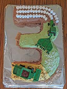 Well okay, it wasn’t as successful in the actual cake part as I was hoping, but that’s life — and Benson did get a tractor and combine on his cake like he wanted. The boy asks for oatmeal at least once a day, so I decided on a simple oatmeal cake as the base. It came out tasting amazing, and was deliciously moist, but due to its density didn’t exactly come out of the pan as well as I had hoped.