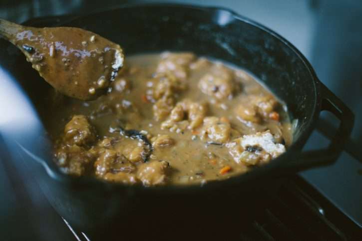 Add the flour and garlic. Cook for one minute, stirring constantly. Add the thyme, sage, vegetable stock and cream. Bring to a simmer. Mix the bisquick and milk together to for a biscuit dough.