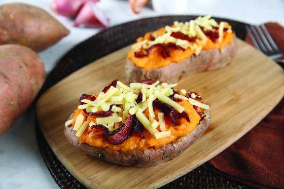 Fill empty potato shells with mixture. Top with remaining cheese and crumbled bacon.